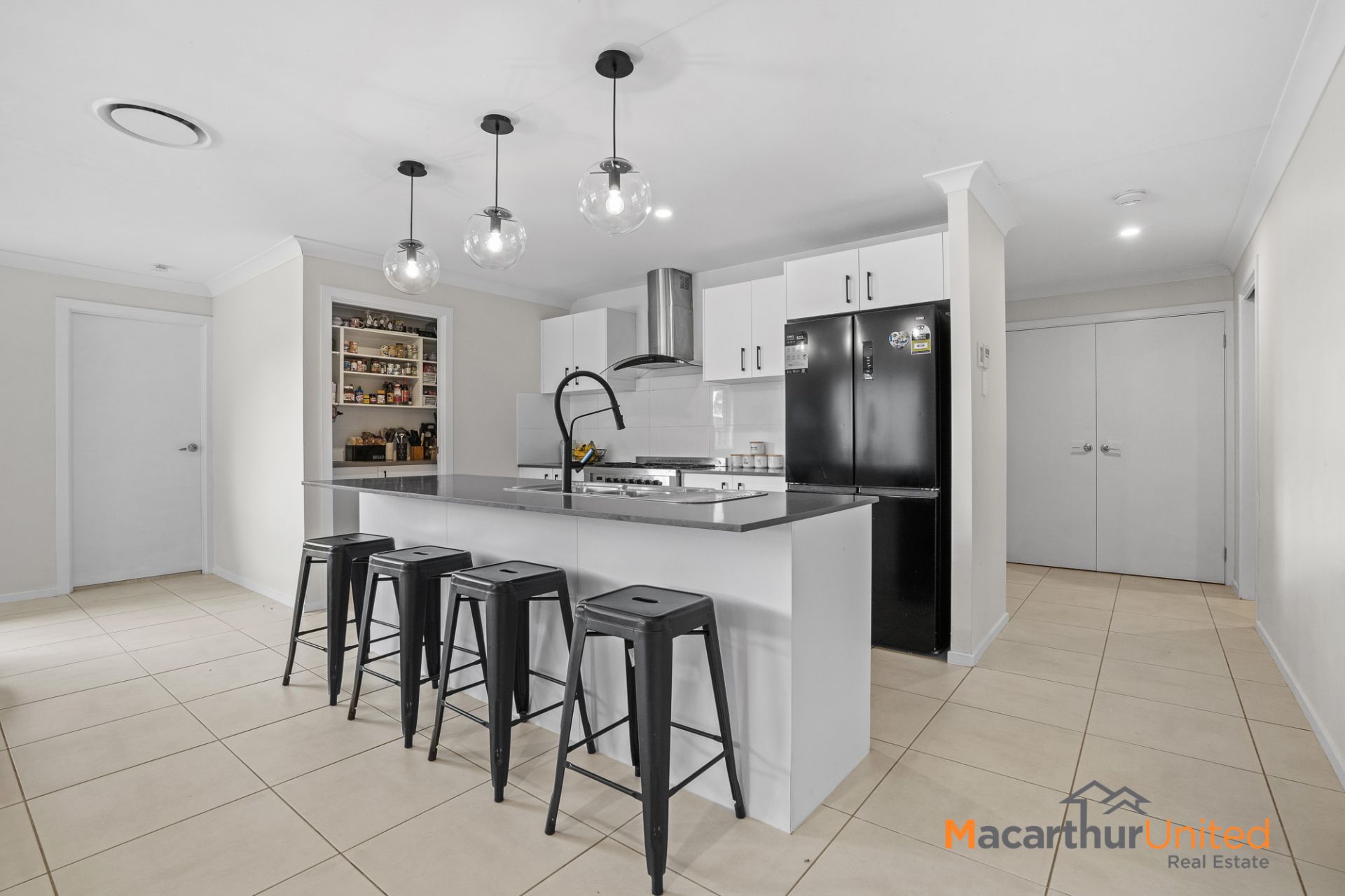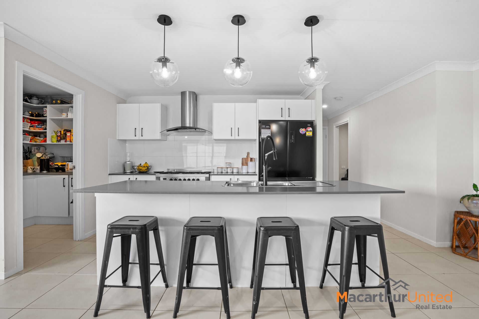 - Kitchen: gas cooktop, stone benchtops, island bench, and ample storage.