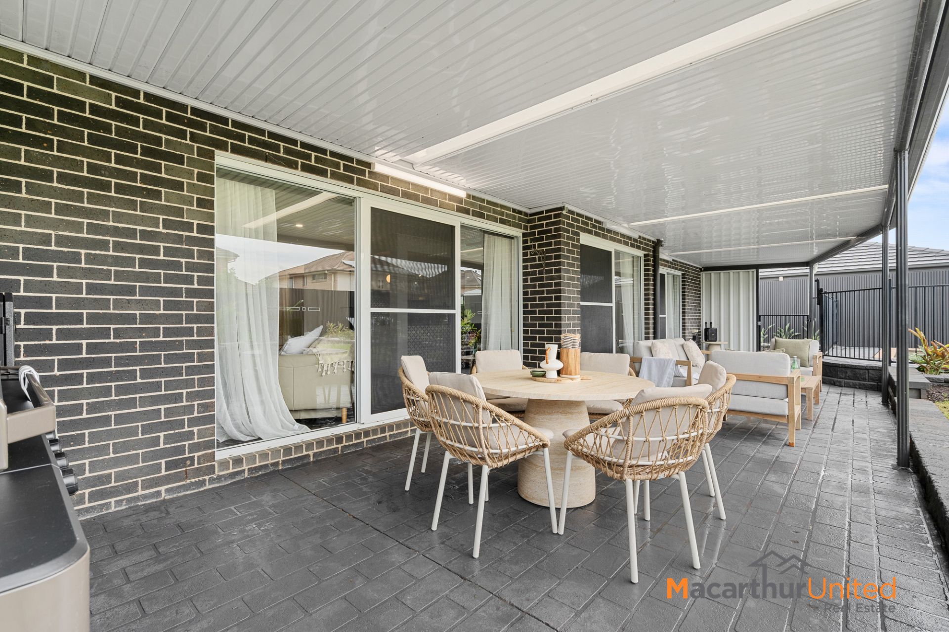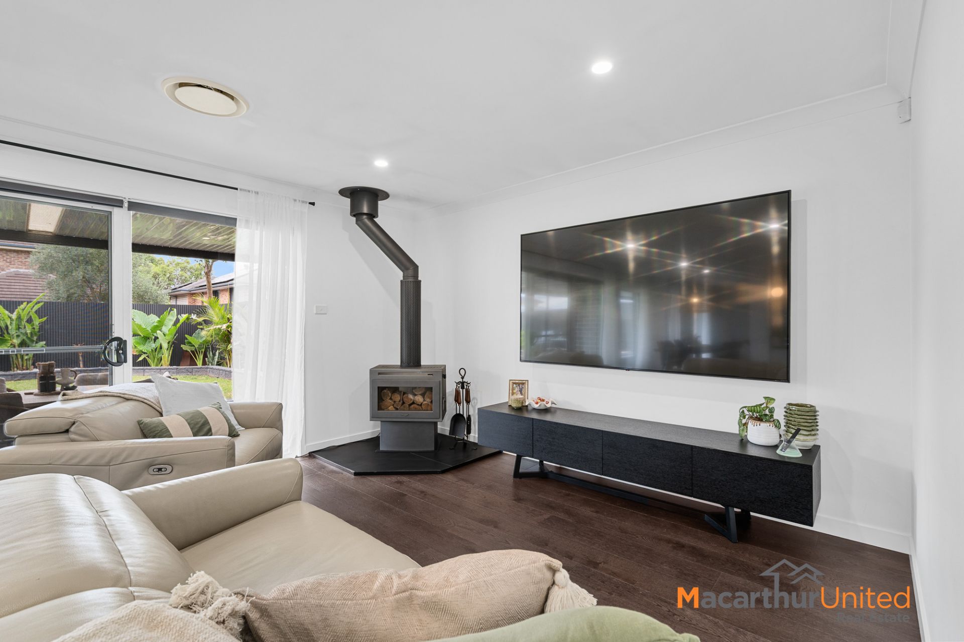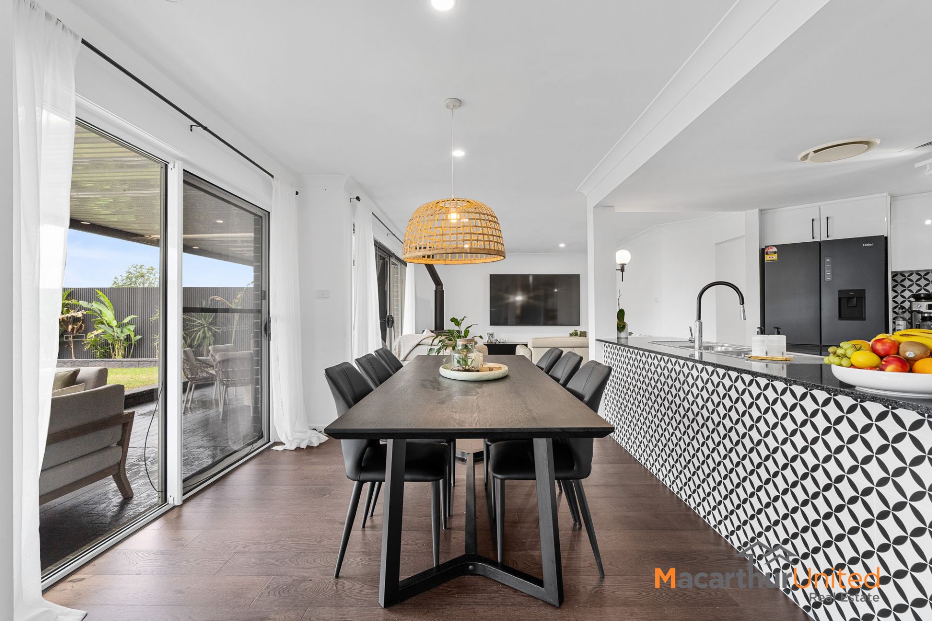 At the heart of the home lies a designer kitchen showcasing a striking star pattern splashback, gas cooking, dishwasher and ample storage. Downlights throughout and ducted AC enhances the home's modern appeal, while ceiling fans in the bedrooms provide additional comfort.
