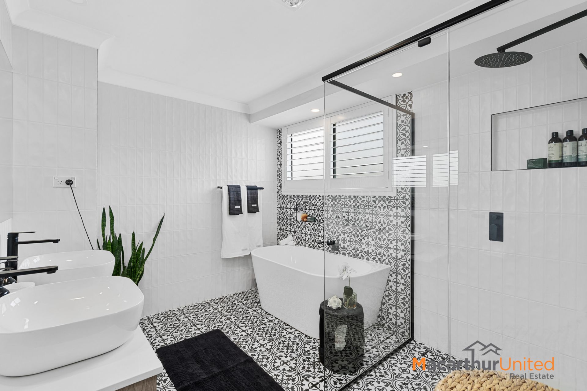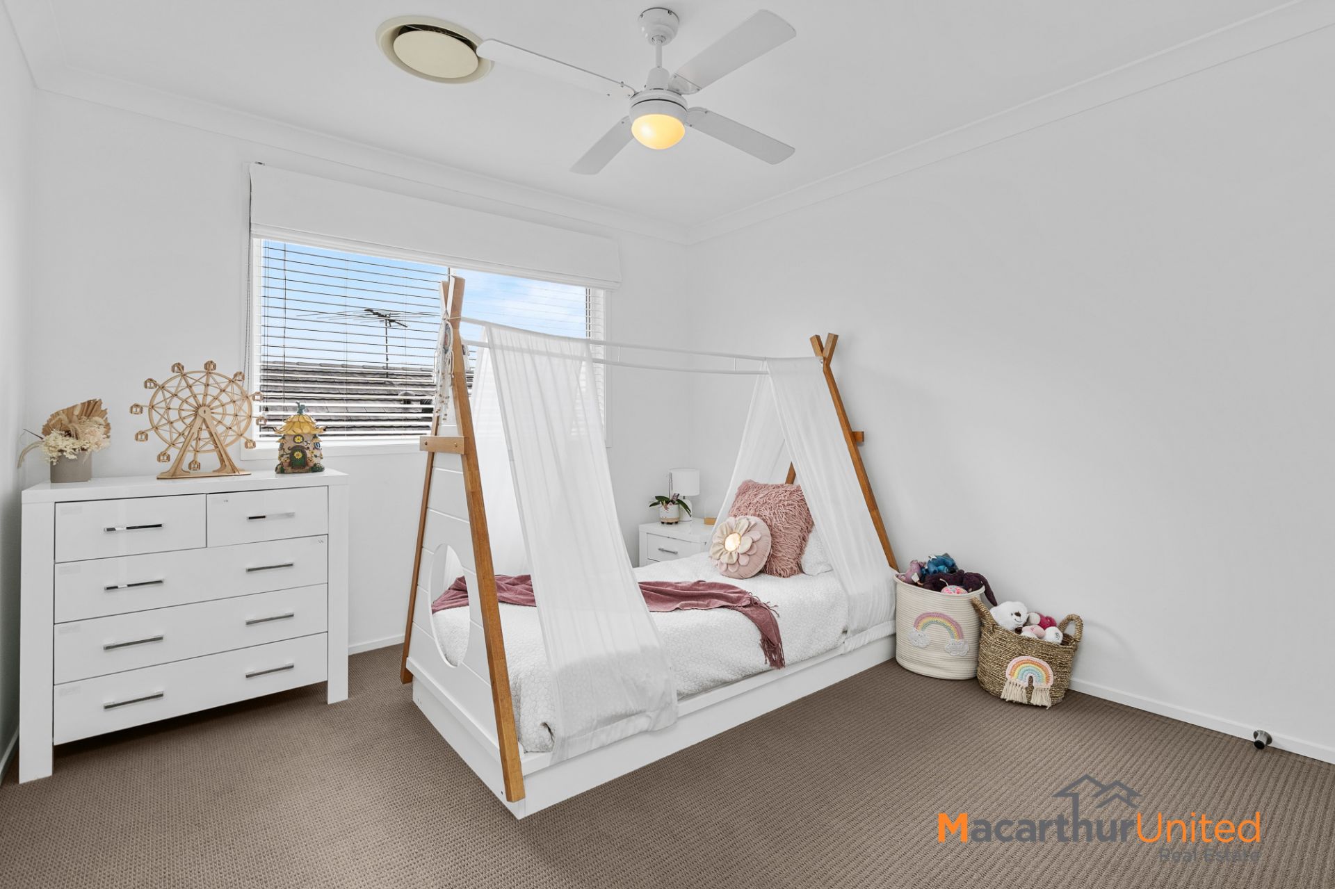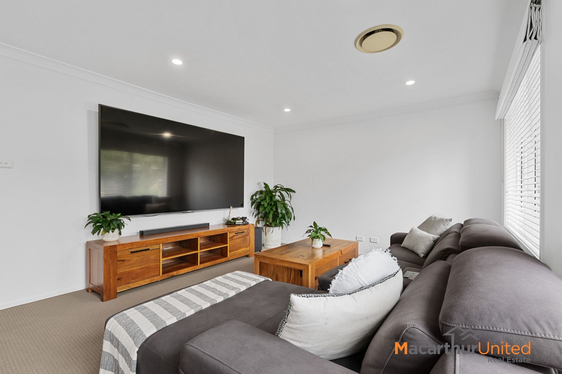 At the heart of the home lies a designer kitchen showcasing a striking star pattern splashback, gas cooking, dishwasher and ample storage. Downlights throughout and ducted AC enhances the home's modern appeal, while ceiling fans in the bedrooms provide additional comfort.